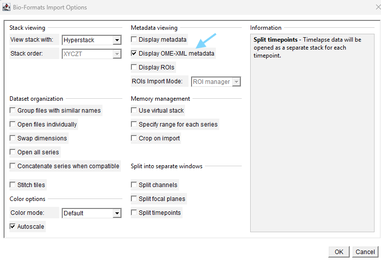 - Open the TIFF in FIJI using: Plugins → Bio-Formats → Bio-Formats Importer. In the import dialog, enable Display metadata and Display OME-XML metadata.