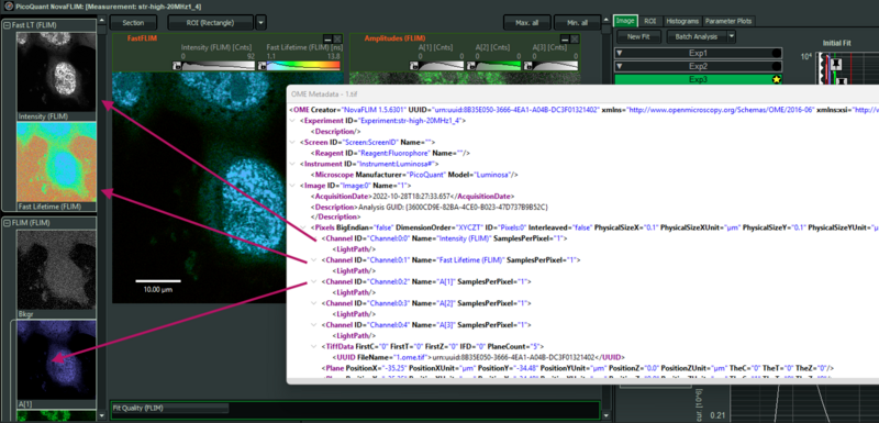 Channel@IDentries. For example,Channel:0:0...refers to the first layer (leftmost in the TIFF viewer), which typically corresponds to the "Intensity (FLIM)" image. Subsequent layers represent additional channels such as "Fast Lifetime (FLIM)", "Slow Lifetime", etc.